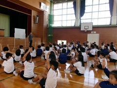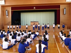 児童の発表の後は「先生のお話」です。今回は1年担任の石井先生の担当でした。先生の子供の頃のお話を皆で楽しく聞きました。また、最後にスポーツ少年団関係の受賞披露もありました。