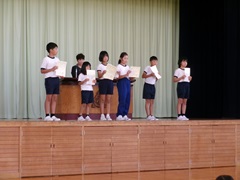 続く授賞集会では、夏休みの作品展や運動会での徒競走での入賞者、わくスタノートの達成者への授賞がありました。どの子も誇らしげに賞状を受け取っていました。