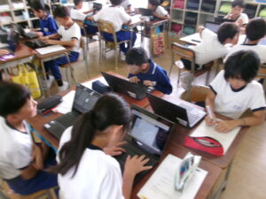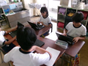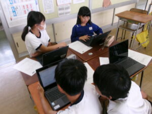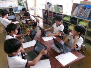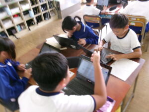 10月3日(金)、4年生は今日から新しいタブレットを使い始めました。みんな、わくわくしながらのスタートです。国語では、ロイロノートと検索機能を使って、秋の言葉を班ごとに集める活動を行いました。班の友達と協力して、たくさんの秋の言葉をまとめることができました。この言葉を使って、来週9日(木)の授業参観では秋の楽しみを俳句で表す予定です。ぜひ、保護者の方にも子供たちと一緒に俳句のよさを味わっていただきたいと思っています。