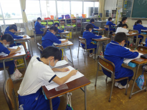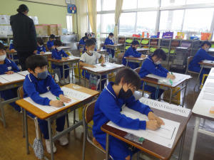 3名の転入生を迎え、全校児童123名で3学期がスタートしました。第3学期始業式では、校長先生は「3学期はまとめの学期。『継続は力なり』、自分の立てた目標に向かって、小さな積み重ねを大切にするように」と話されました。その後、書初め大会を、1・2年生は各教室で、3~6年生は体育館で行いました。きれいな字が書けますようにと願いを込めて、一筆一筆集中して書きました。