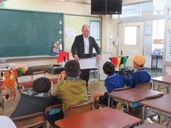 西島さんは自作のスライド資料を基に、荒俣獅子舞の歴史や内容、今後の課題等について教えてくださいました。子供たちは「夜何時までお祭りがありますか?」「火渡りは熱くないですか?」などと質問していました。最後に、獅子舞で実際に使う刀や傘、天狗のお面等を手にして重さや感触を確かめていました。西島さんは「それぞれ自分の住んでいるところのお祭りを大切にしてください。荒俣のお祭りにも興味をもった人は是非見に来てください。小学生も毎晩練習をしています」と話されました。