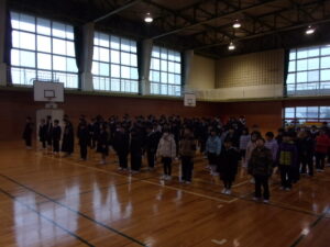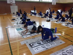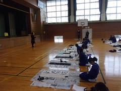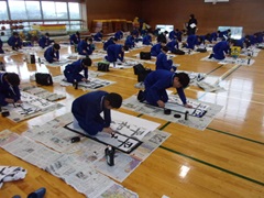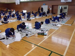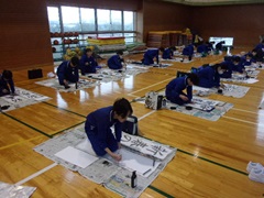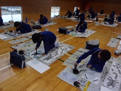 校内書初め大会を行いました。3~6年生(毛筆)は体育館で、1~2年生(硬筆)は各教室で行いました。決められた時間内に各々集中して3枚分の揮毫に取り組みました。