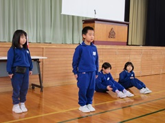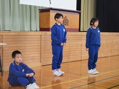 1月26日(月)、1月の玉椿集会を行いました。子供たちは思い思いに防寒具を着込むなどして体育館に集まりました。