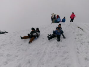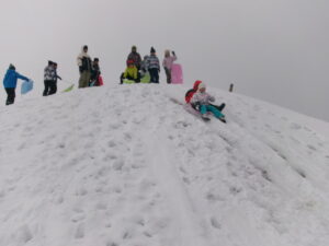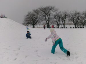 最初はそり滑りが怖かった子供たちも、勇気を出して友達と一緒に滑ることで度胸がついたのか、何度も滑っていました。それぞれがやりたい遊びを友達と楽しんでいました。足をとられながらも雪の上を走ったり、雪玉を投げたりするなどたくさん体を動かしました。
