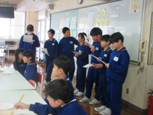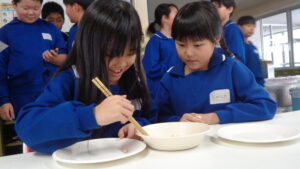 給食委員会が、楽しみながら箸の持ち方や使い方を身につけることを目的に、全校から参加者を集めて開催しました。