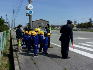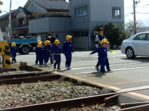 お二人の指導講話を聞いた後、1年生は現地指導を行い、横断歩道や踏切の渡り方、安全な道路の歩き方を確認しました。