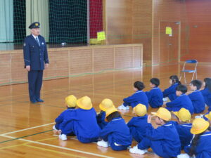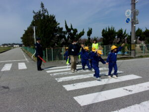 4月14日(火)に村椿駐在所巡査部長さん、黒部市交通安全協会の交通指導員さんをお招きして、1,2年生交通安全教室を行いました。