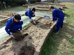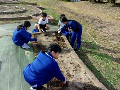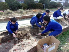 12月2日(火)の昼休み、椿キラキラ環境委員会が全校児童にボランティアを募り、チューリップの球根を学校花壇の「濟美園」に植えました。たくさんのボランティアが集まり、約150個も球根がありましたが、あっという間に植え付けが終わりました。