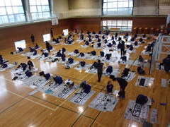校内書初め大会を行いました。3~6年生(毛筆)は体育館で、1~2年生(硬筆)は各教室で行いました。決められた時間内に各々集中して3枚分の揮毫に取り組みました。