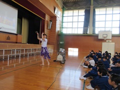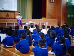 「先生のお話」では、世界の平和のために自分ができることを少しずつ続けているという先生の話を聞きました。学生時代からグアム・サイパンの人々と交流し、その文化を日本に広めようとしている話と歌や踊りの実演に、子供たちは見入っていました。
